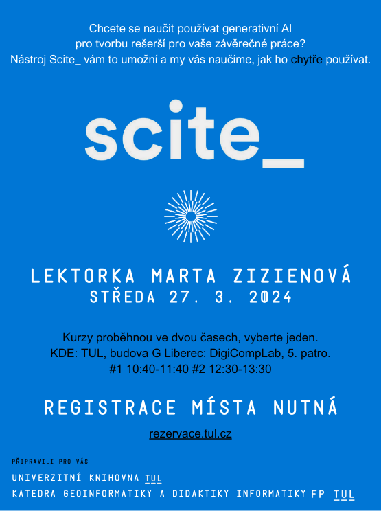 Chcete se naučit používat generativní AI pro tvorbu rešerší pro vaše závěrečné práce? Nástroj scite_ vám to umožní. Díky spolupráci s Univerzitní knihovnou TUL mají studentky a studenti FP TUL příležitost rychlého a praktického seznámení s nástrojem na hodinovém kurzu. Ten se uskuteční ve středu 27. 3. 2024 v DigiCompLab. Co se dozvíte? Čtěte dále v článku.