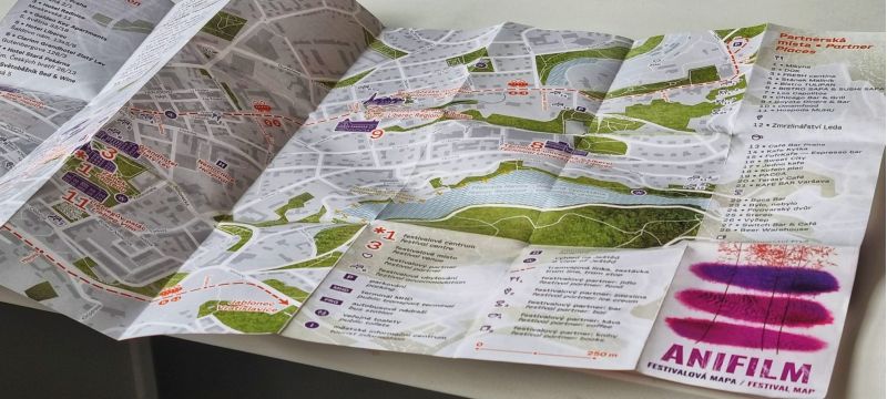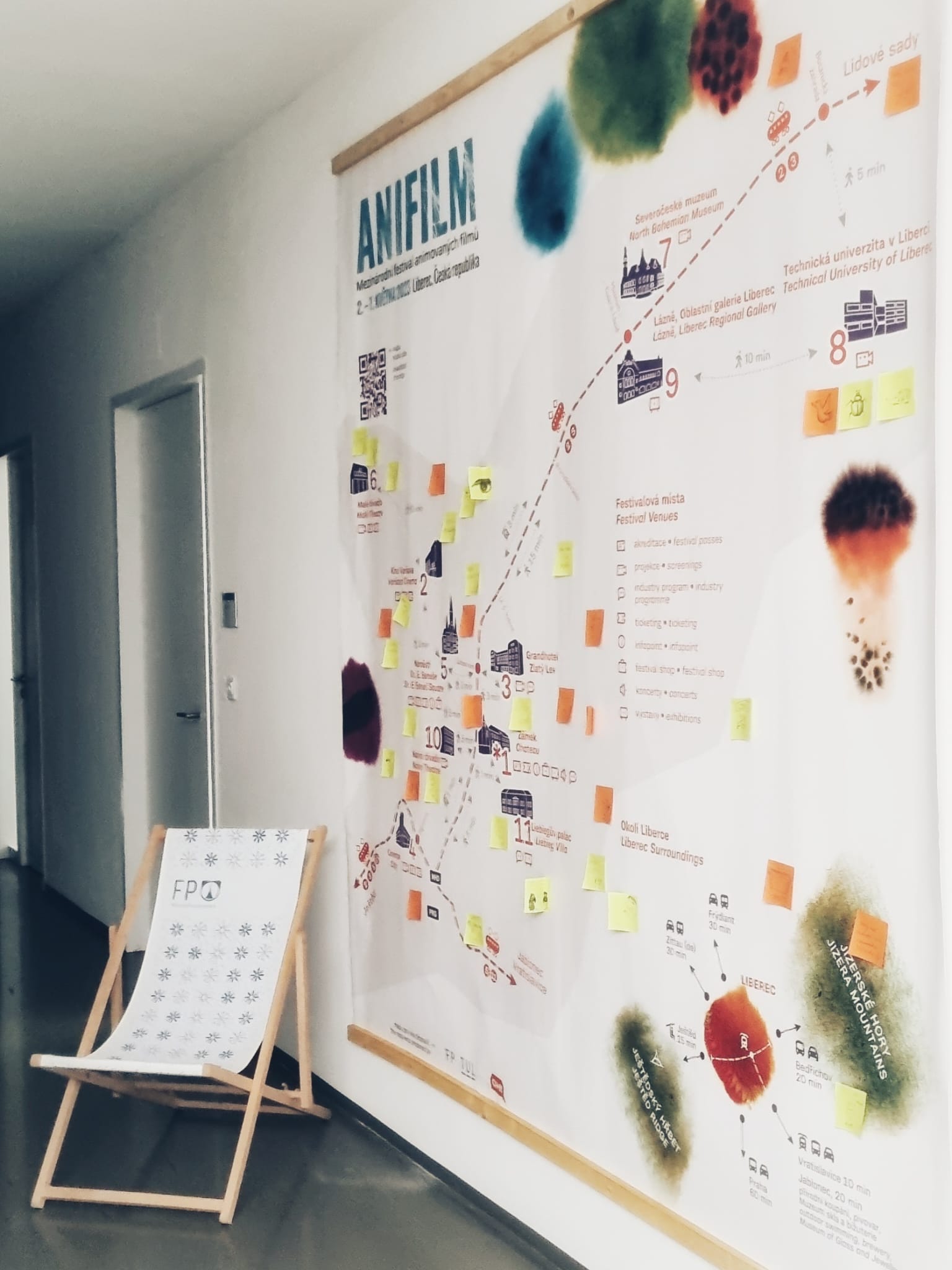 In 2020, the Anifilm International Animation Film Festival relocated from Třeboň to Liberec. Since its first edition in Liberec, we have been working closely with the organizers to create a festival map. The same was true for the most recent edition, which took place in May at the Liberec castle and other venues in the surrounding area. As a new addition, we included a large wall map that served as a message board for festival guests.